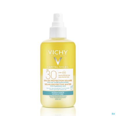 Vichy's Capital Soleil SPF30 Hydraterend Zonbeschermend Water heeft een combinatie van zeer hoge UV-A/UV-B bescherming met een aangename textuur. Dit zonbeschermende water is in de eerste plaats zeer hydraterend. De nevel voelt ultra-licht en ultra-verfrissend aan op de huid. De zonnemist met spf laat een onzichtbare, niet-plakkerige finish achter. De baanbrekende tweefasige formule, ultralicht en ultrafris, biedt geavanceerde bescherming op vier niveaus (UV-A,UV-B, lange UV-A en antioxidanten). De formule is verrijkt met hyaluronzuur voor 24 uur hydratie. De formule is in mariene omstandigheden getest om zeker te zijn dat hij niet schadelijk is voor de aquatische biodiversiteit. De frisse, waterachtige textuur van dit zonnewater laat geen witte sporen na en plakt niet. Het voelt licht aan op de huid en wordt snel geabsorbeerd voor ultiem comfort.