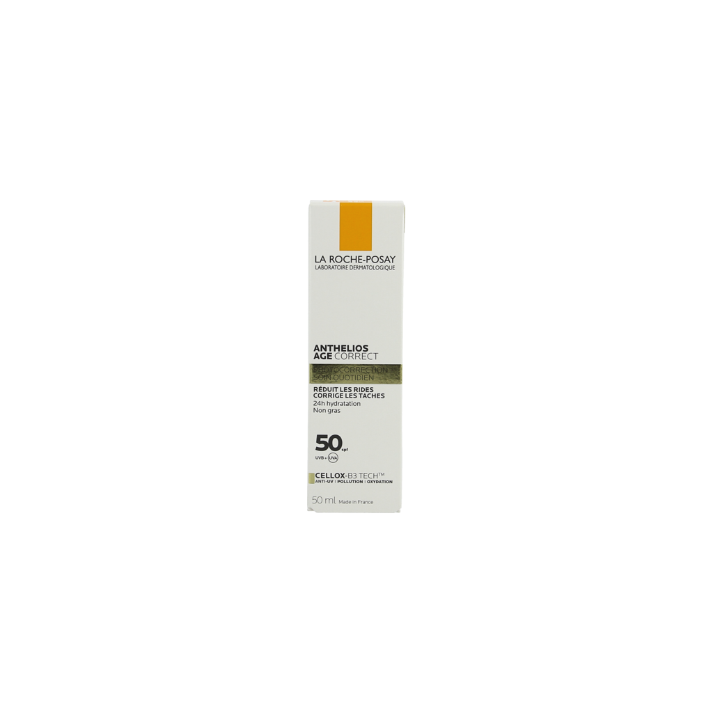 Anthelios Age Correct SPF50 zonbescherming is een zonnecrème tegen rimpels en donkere vlekjes voor het gezicht met een zeer hoge SPF 50 UVA/UVB-bescherming. De crème helpt de tekenen van huidveroudering in 4 weken verkomen en verminderen door fijne lijntjes en rimpels op te vullen en de fysiologische mechanismen van huidvernieuwing te stimuleren. De zonnecrème biedt ook bescherming tegen vervuiling (door de aanhechting van vervuilende deeltjes op de huid te beperken) en bescherming tegen oxidatie (door oxidatieve stress veroorzaakt door vervuiling en infrarood te voorkomen).