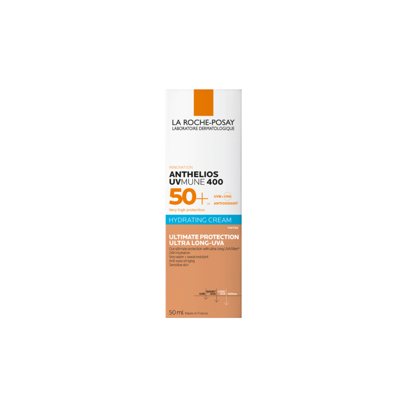 ANTHELIOS UVMUNE 400 HYDRATERENDE GETINTE CRÈME SPF50+: Bevat MEXORYL 400, de meest effectieve UV-filter tegen de meest verraderlijke UV-stralen: LANGE UVA*. Onze ultieme bescherming (UVB + UVA + LANGE UVA) tegen diepe celbeschadiging