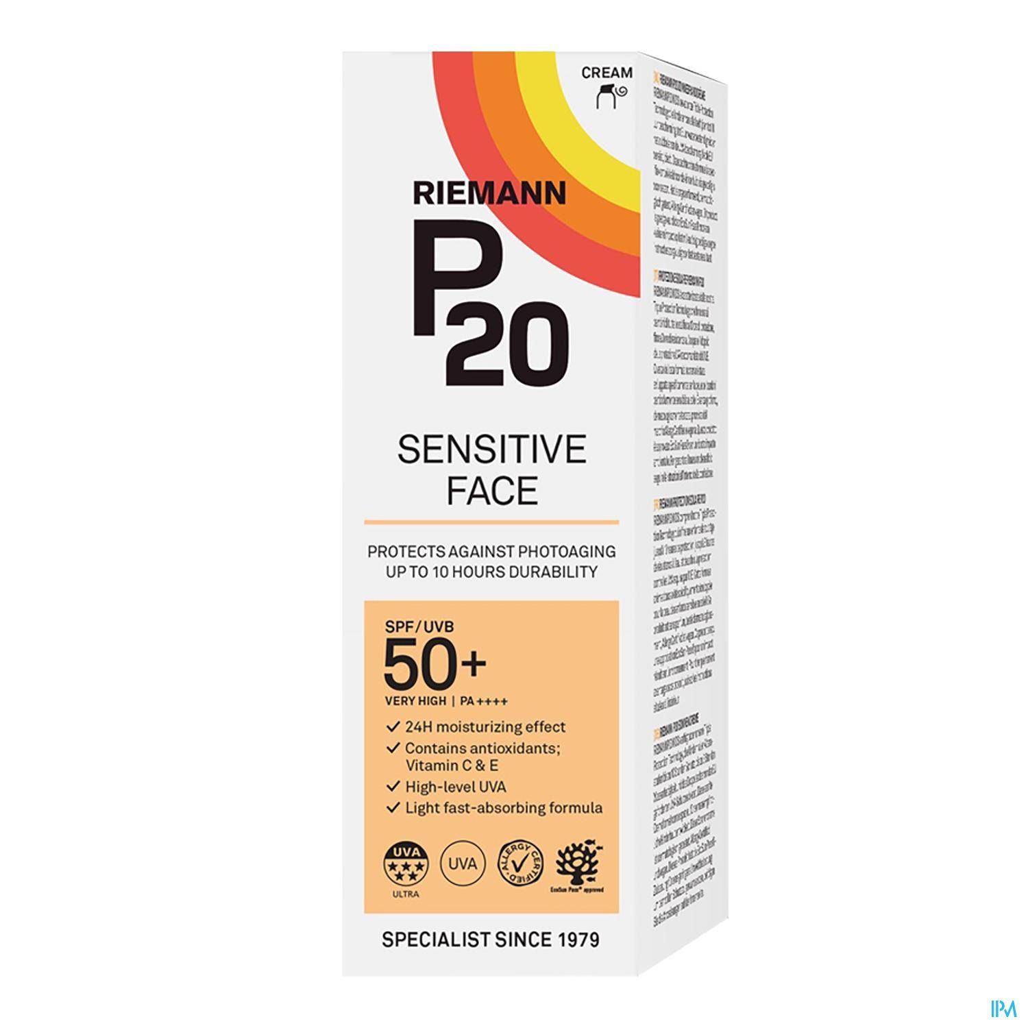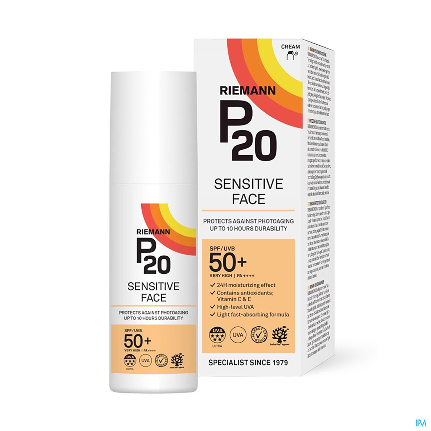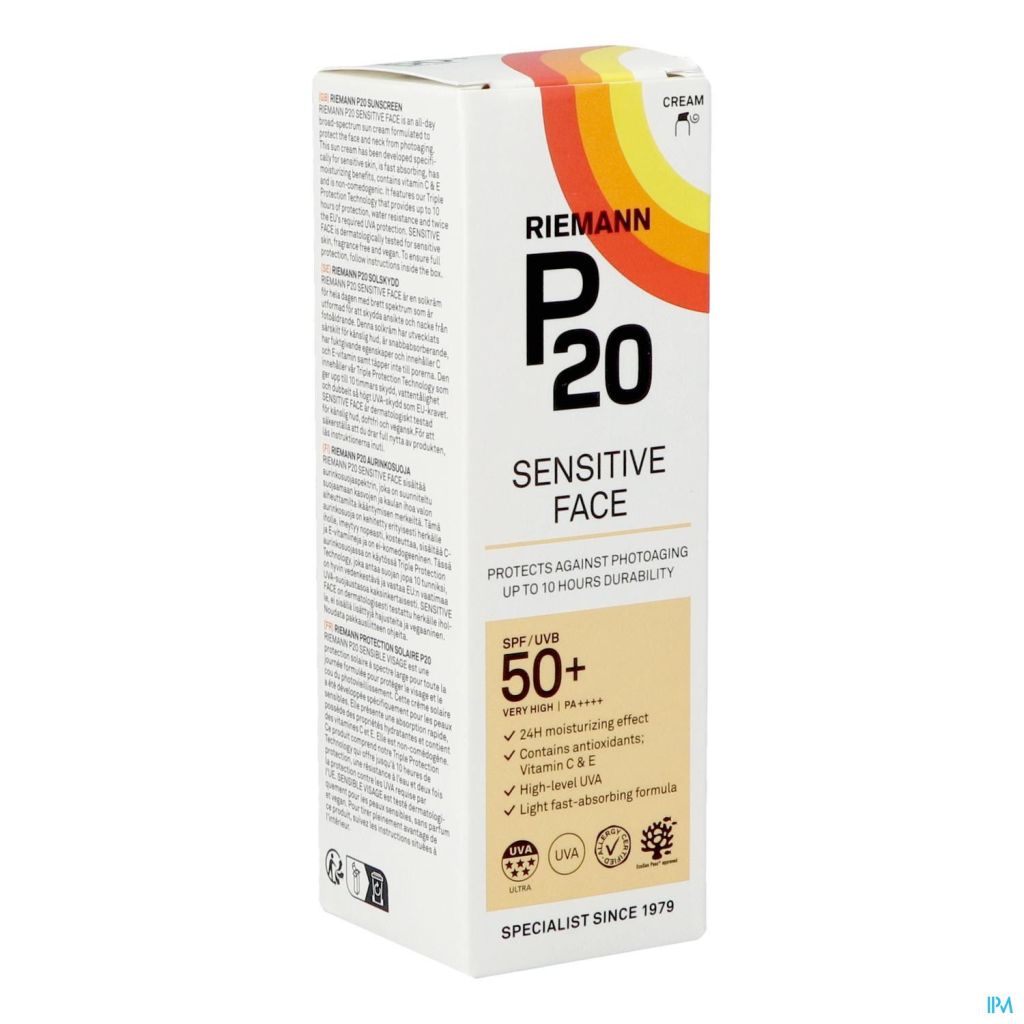 P20 Sensitive Face IP50+ is een zonnecrème met een lichte textuur, speciaal ontwikkeld voor het gezicht en de hals. De crème helpt de huid te beschermen tegen door de zon veroorzaakte veroudering (fotoveroudering) en is geschikt voor de gevoelige huid. Sensitive face bevat Triple Protection technologie die tot 10 uur bescherming biedt en een hoge UVA-bescherming bevat. De crème is dermatologisch getest voor de gevoelige huid, bevat geen parfum en is veganistisch.