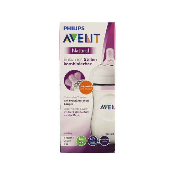 Ultrazachte speen om het gevoel van de borst na te bootsen, De brede speenvorm lijkt op een borst, voor natuurlijk aanleggen, Flexibel, spiraalvormig design in combinatie met comfortkussentjes, Antikrampjes-ventiel vermindert darmkrampjes en ongemak, Antikrampjes-ventiel vermindert darmkrampjes en ongemak, Eenvoudig te gebruiken en schoon te maken, en snel en eenvoudig in elkaar te zetten, Spenen met verschillende toevoersnelheden verkrijgbaar, Compatibel met het Philips Avent Natural-assortiment, Deze fles is BPA-vrij
