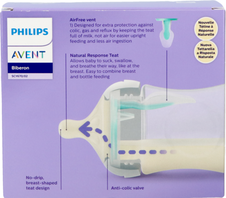 Kalm en comfortabel voeden. De Natuurlijke Zuigreflex-speen ondersteunt het unieke ritme van je baby voor zuigen, doorslikken en ademen. Het AirFree-ventiel is ontworpen om ondertussen lucht weg te houden uit de buik, om krampjes, gas en brandend maagzuur te voorkomen.