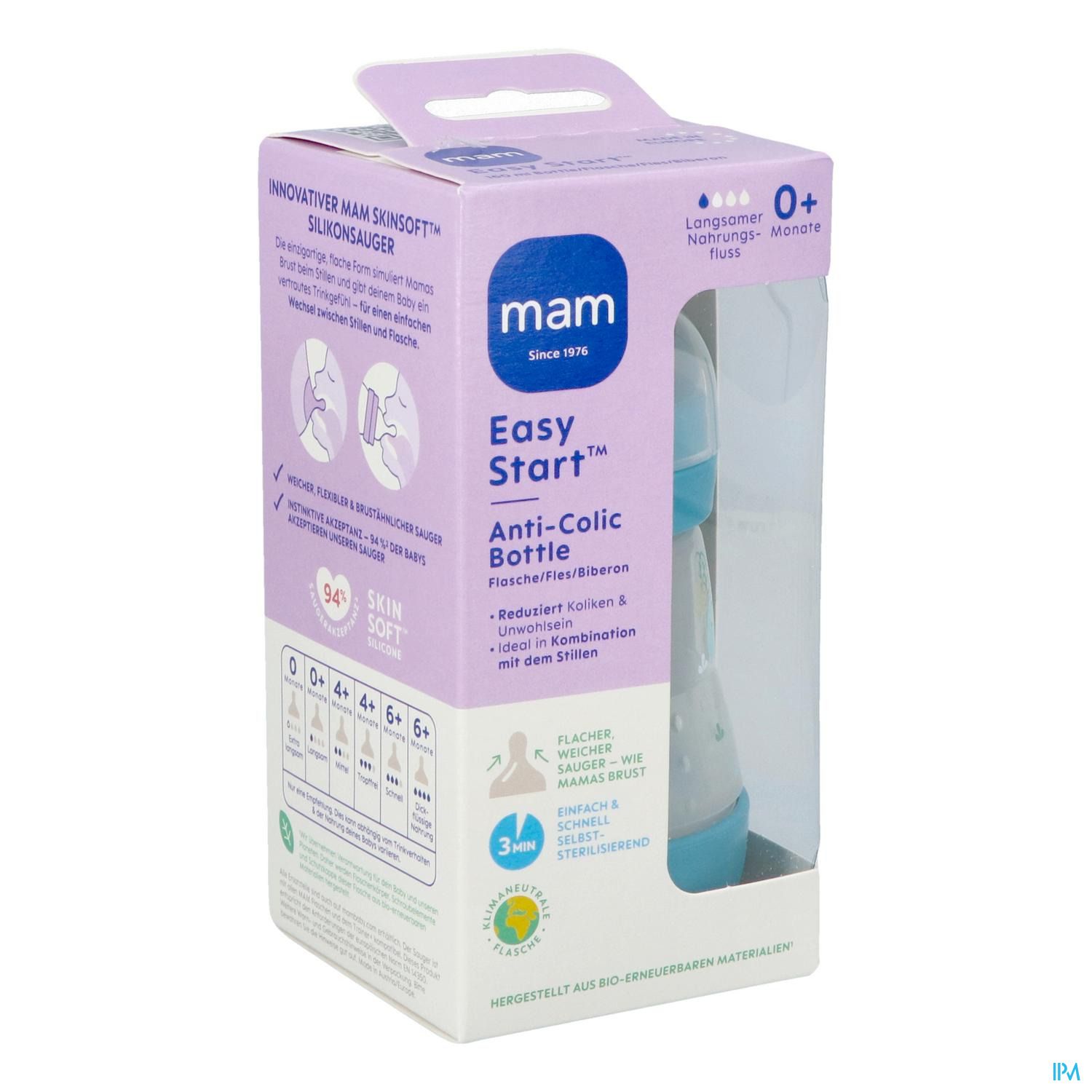 Het MAM Easy Start™ Anti-Colic-flesje is het ideale babyflesje voor flessenvoeding aan pasgeborenen: baby's kunnen drinken in hun eigen tempo en op een ontspannen manier.