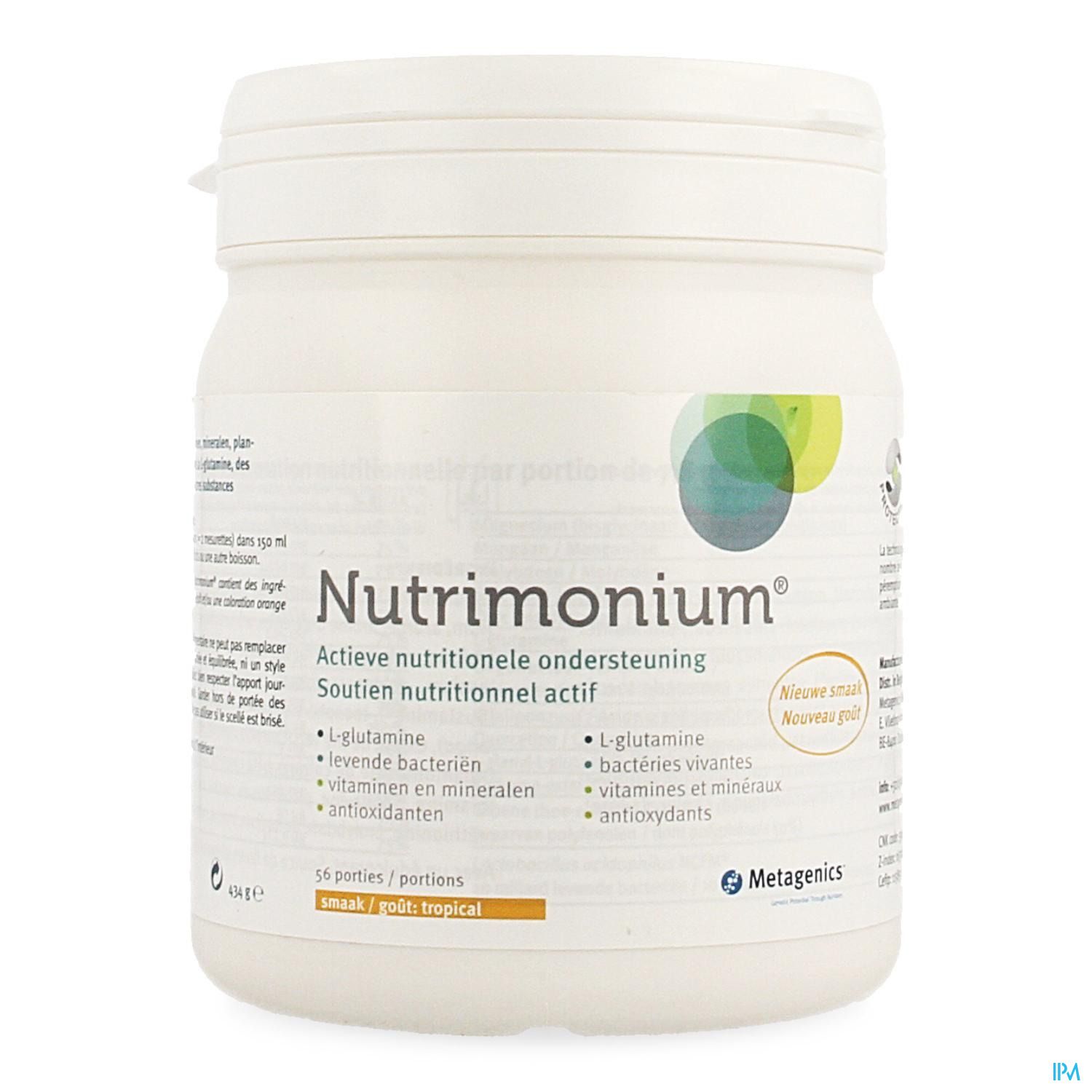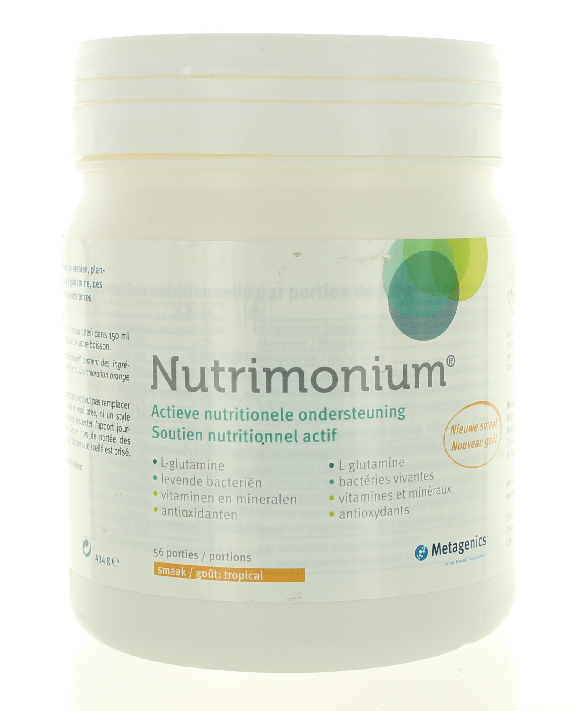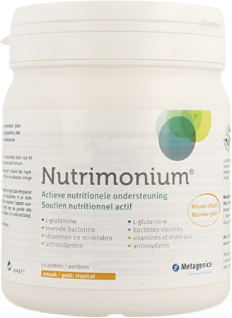 Om het lichaam gezond te houden moeten verschillende lichaamsfuncties goed functioneren. Nutrimonium is een compleet voedingssupplement met L-glut., levende bacteriën, vitaminen, mineralen en antioxidanten, speciaal ontwikkeld als nutritionele basisondersteuning.Nutrimonium Original bevat zoetstoffen van natuurlijke oorsprong uit de Steviaplant.Kenmerken:- Brede werking- Met L-alanyl-L-glut. (Sustamine): goed opneembare vorm van L-glut.- 10 miljard levende bacteriën (Lactobacillus acidophilus NCFM)- Vitaminen en mineralen in goed opneembare vormen- Mix van antioxidanten: groene thee-extract, vitamine E, vitamine C, bètacaroteen en selenium- Uitgebalanceerd multivitaminen- en mineralenmengsel: 75% van de aanbevolen dagelijkse hoeveelheid- Stabiel bij kamertemperatuur dankzij de ProtectAir technologie. Deze exclusieve productietechnologie - speciaal ontwikkeld door Metagenics - garandeert het aantal levende bacteriën en de kwaliteit ervan tot op het einde van de houdbaarheid.
