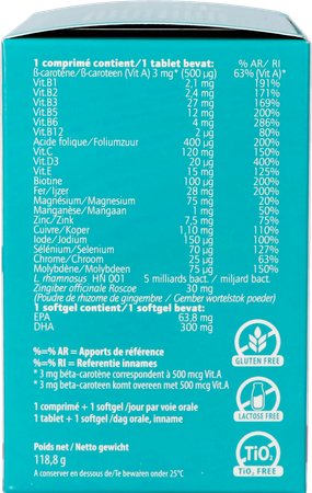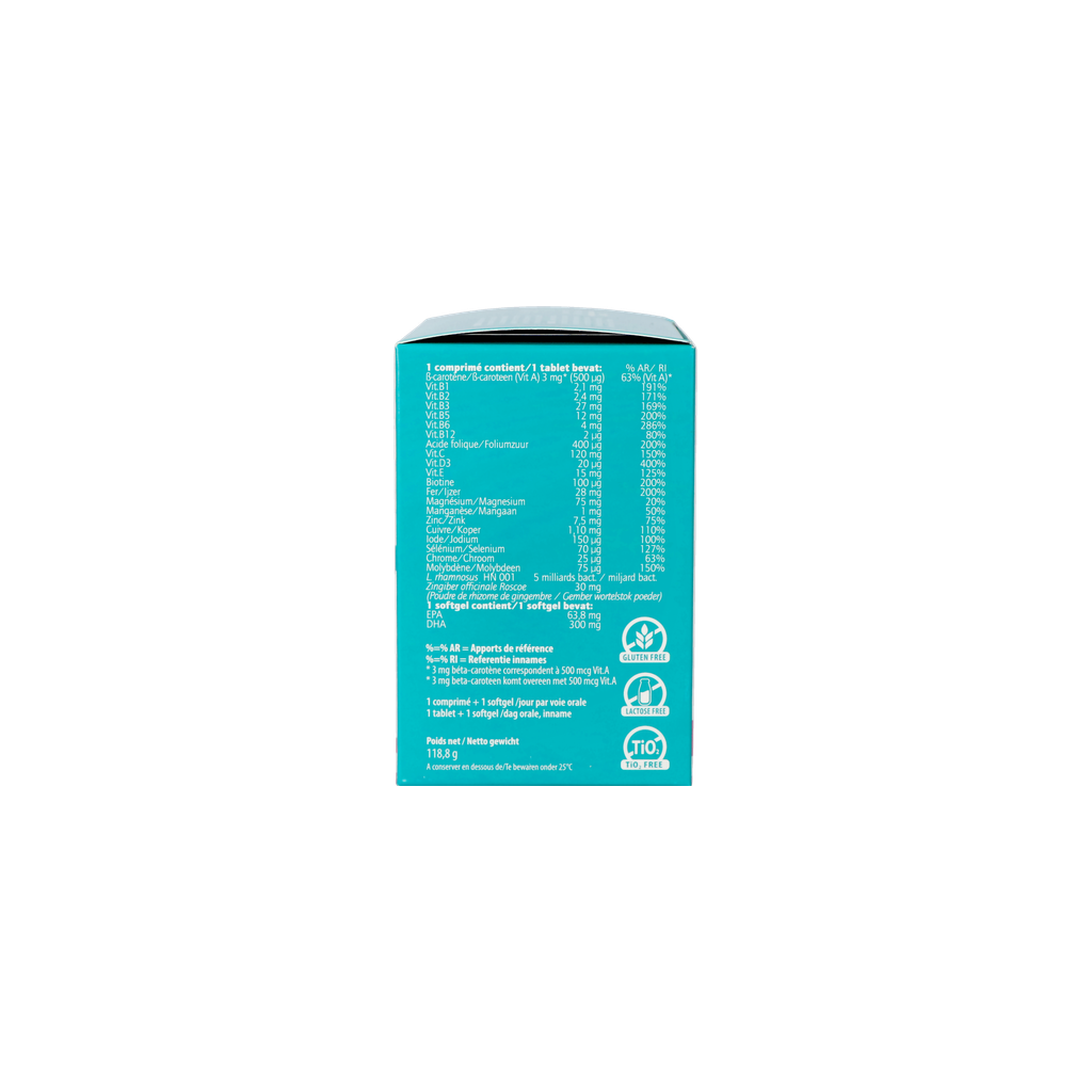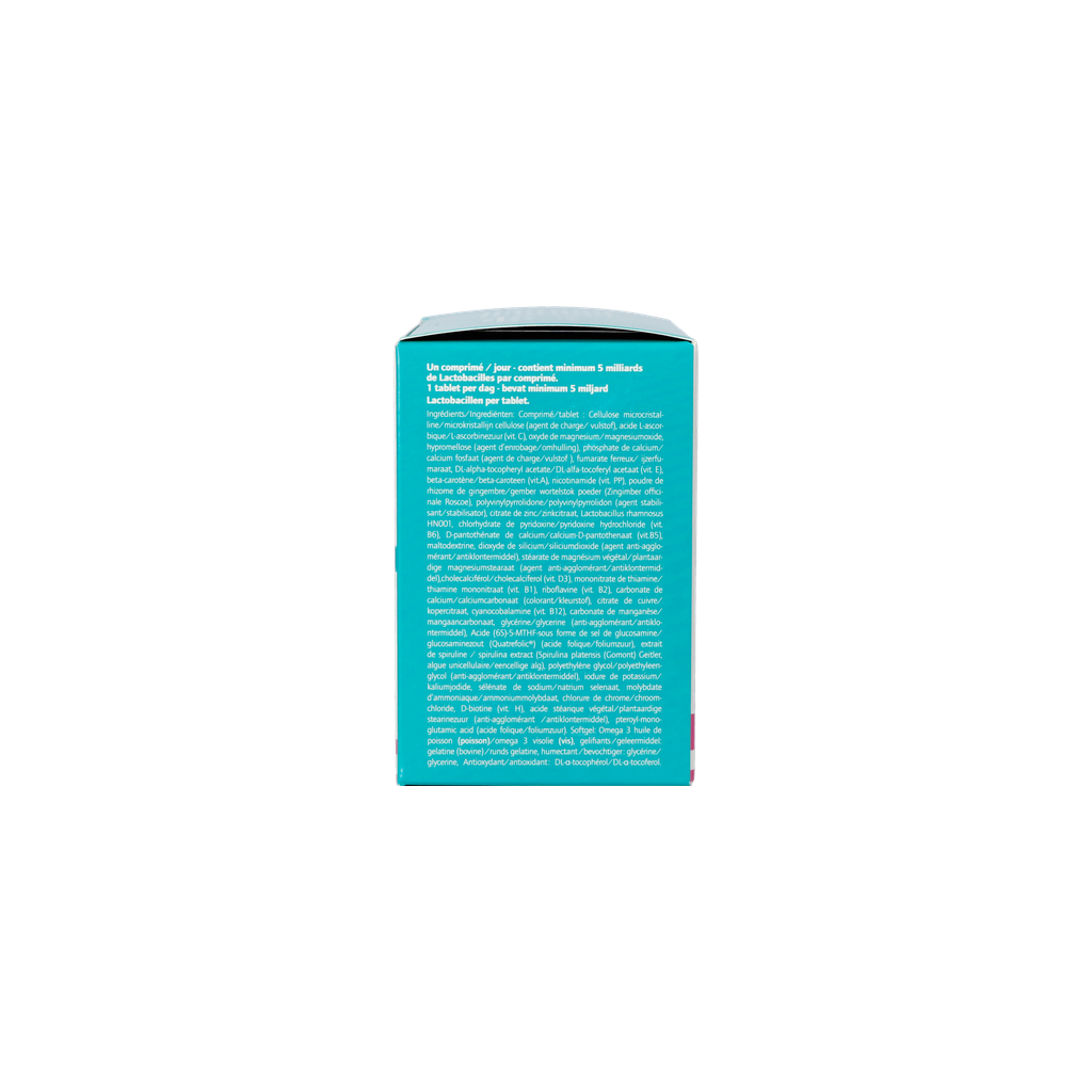 - Multivitamine en mineralen complex verrijkt met lactobacilli specifiek voor de zwangerschap en borstvoeding. Deze dragen bij tot het behoud van de goede werking van het immuunsysteem.