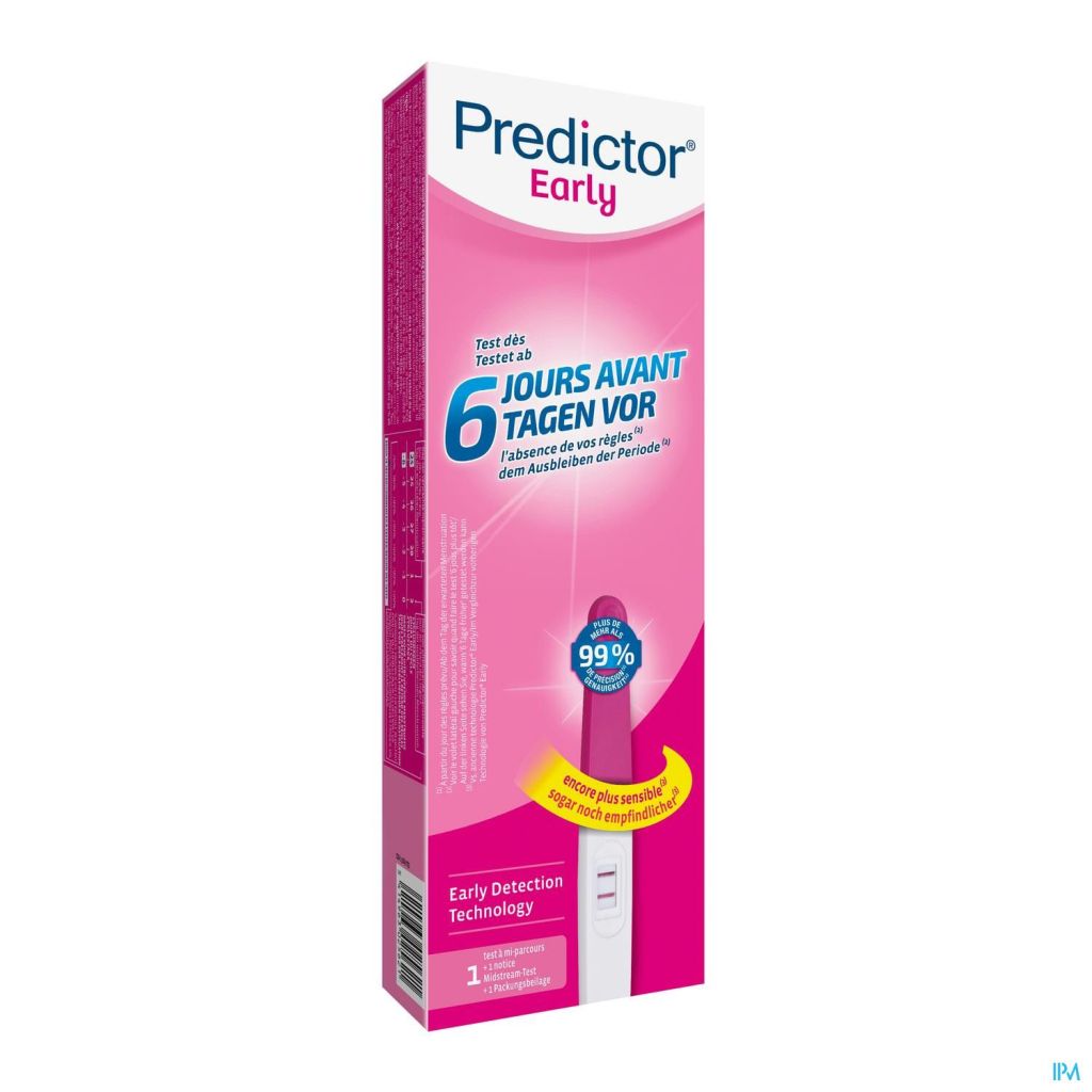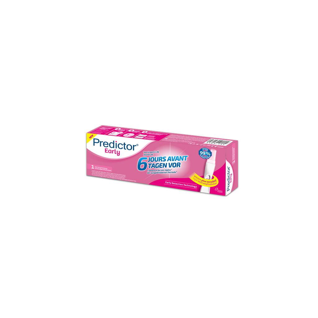 Predictor® Early kan het zwangerschapshormoon detecteren vanaf 6 dagen voordat uw menstruatie uitblijft. Dankzij de Early Detection Technology kan Predictor® Early lage concentraties van het zwangerschapshormoon detecteren, vooral de vroege variant van het zwangerschapshormoon. Dankzij deze unieke technologie kan Predictor® Early een zwangerschap vroeger detecteren dan om het even welke andere zwangerschapstest, en dit met een ongeëvenaarde nauwkeurigheid.