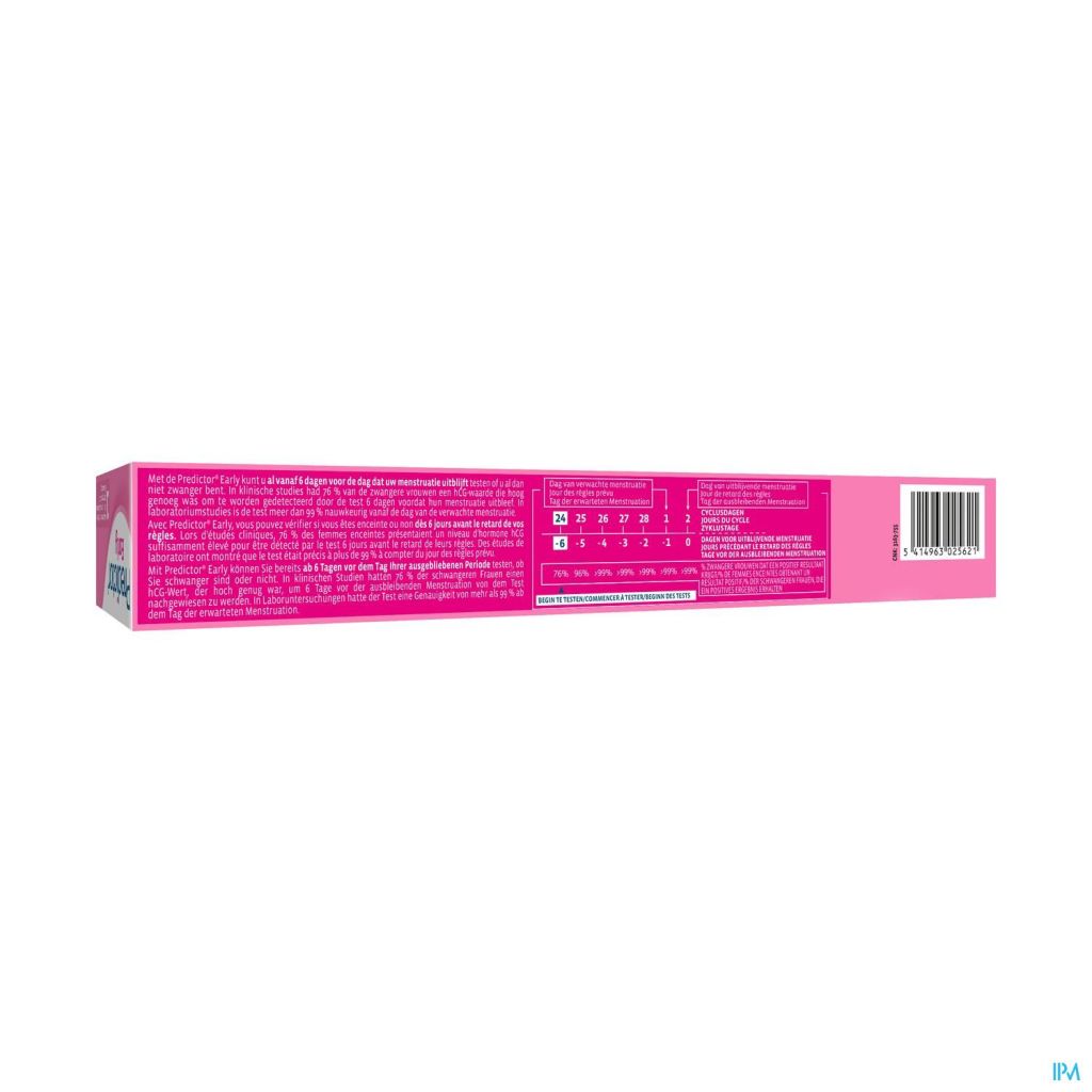 - Een zeer betrouwbare test: in de Laboratoriumstudies is Predictor® Early meer dan 99 % nauwkeurig vanaf de dag van de verwachte menstruatie.